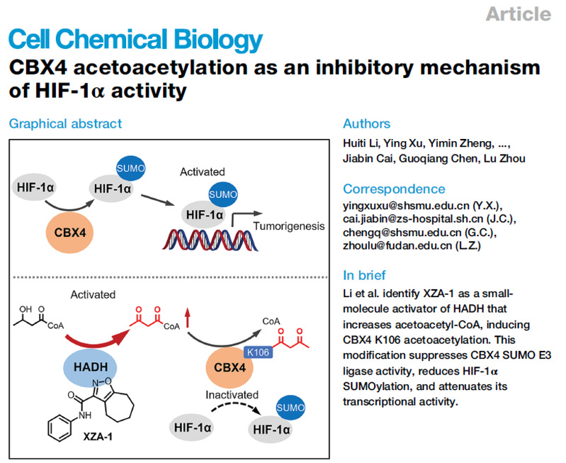 近日,9色视频 周璐教授课题组联合陈国强院士及樊嘉院士/蔡加彬副主任医师团队发现了一种调控HIF-1α转录活性的新机制,相关工作以“CBX4 acetoacetylation as an inhibitory mechanism of HIF-1α activity”为题在线发表于Cell Chemical Biology杂志。