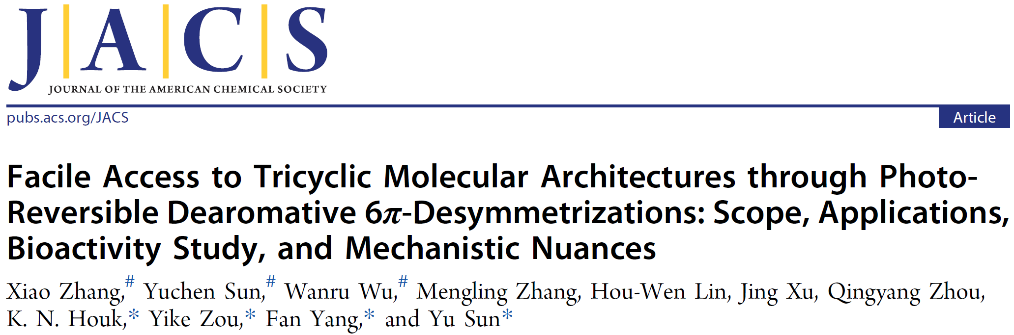 9色视频 孙域课题组近期发展了光调控的可逆6π去芳构化反应,相关成果以Facile Access to Tricyclic Molecular Architectures through Photo-Reversible Dearomative 6π-Desymmetrizations: Scope, Applications, Bioactivity Study, and Mechanistic Nuances为题,在线发表于权威期刊Journal of the American Chemical Society。