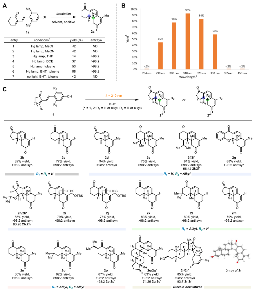 在去对称化、去芳构化6π电环化反应研究中,项目团队首先对该反应的条件进行了探索,确定了甲苯为最佳溶剂(图2A)。同时,该团队发现BHT的添加可对原料予以保护,避免氧化等副反应的发生。在筛选光源的平行实验中,该反应的有效波段主要位于290nm-330nm之间,其中310nm具有最高的反应效率(93%,图2B)。利用该最优条件,项目团队完成了2a-2r等四类共18个复杂多环化合物的高效合成(收率65%-94%,图2C)。其中化合物2n-2p含有挑战性较强的连续季碳结构,化合物2g、2h、2i、2r等具备多种官能团,证实了该反应具备良好的成键能力与底物兼容性。