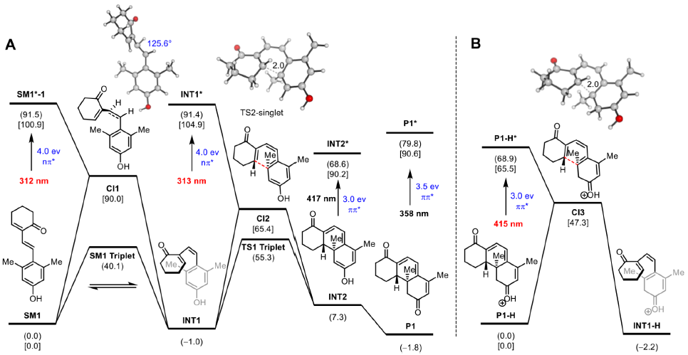 理论方面,该光可逆反应在不同波长下方向逆转的机理同样引人关注。交通大学9色视频 邹一可及UCLA Houk团队采用DFT方法对此进行了探究,证实该光可逆反应的方向由入射光波长与质子化状态协同调控(图6):高能紫外光(310 nm) 驱动正向反应,依次经 光致 E→Z异构化 与 光促 6π-电环化 生成热力学稳定产物 P1;低能可见光(450 nm) 在 酸辅助下 通过质子化物种 P1−H的吸收,驱动逆向 6π-电环开环,实现反应逆转。