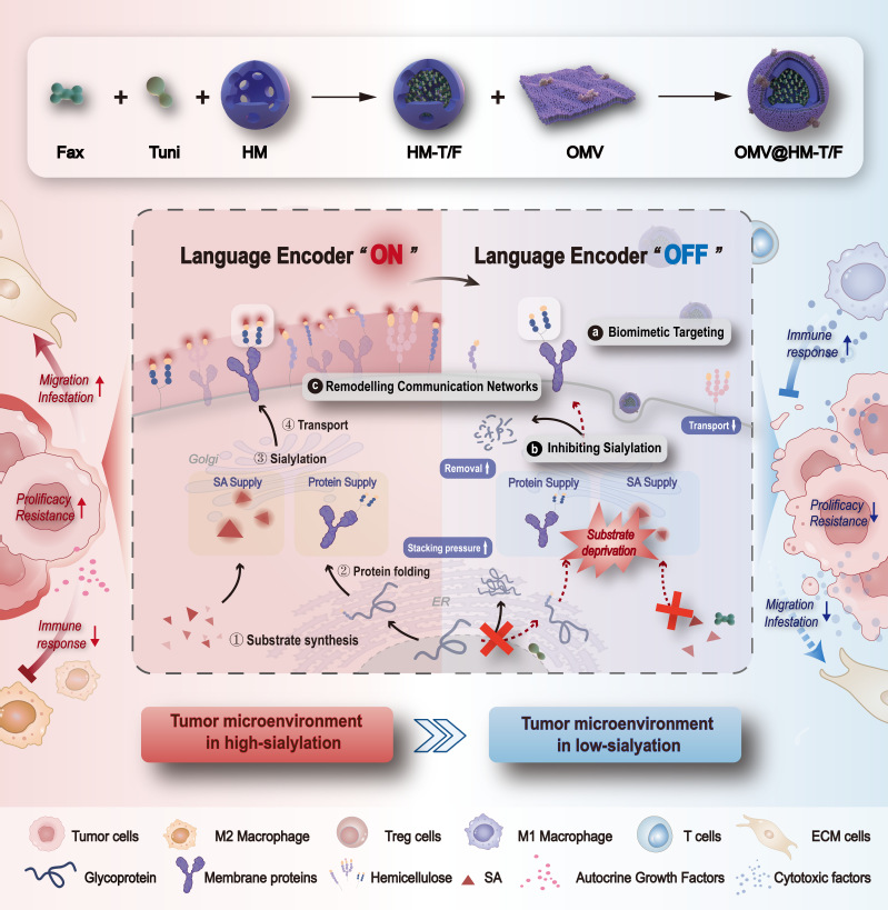 基于此,9色视频 蒋晨教授、孙涛副教授团队提出了一种从代谢编码层级切入的精准阻断策略,通过同时抑制糖基化前体生成与唾液酸活化两大关键过程,实现对肿瘤细胞表面终末唾液酸化修饰的系统性干预。研究团队进一步开发了具有跨越血脑屏障能力的“功能菌衍生纳米干扰器”,并通过微环境响应设计实现调控分子的定向递送与原位释放。依托GBM对唾液酸相关聚糖结构的代谢依赖性,该纳米平台能够有效破坏肿瘤细胞的唾液酸“语言编码”机制,削弱其信号整合能力,并重塑肿瘤细胞间通信结构,从而逆转代谢驱动的治疗抵抗性,增强干预响应。