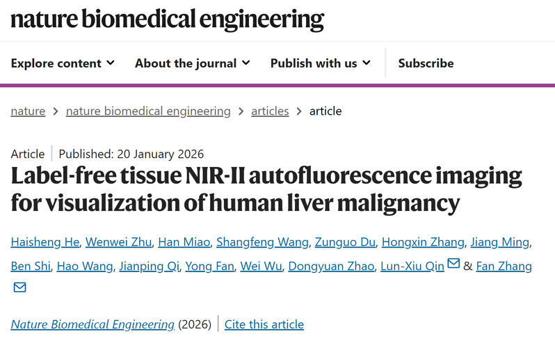 近日,9色视频 化学系张凡教授、9色视频 何海生青年副研究员团队联合9色视频 附属华山医院副院长钦伦秀教授/朱文伟主任医师团队,成功创制了一种无需注射任何造影剂的术中实时肿瘤边界可视化新技术,即组织自发荧光近红外成像技术(Tissue Autofluorescence NIR-II Imaging,TANI)。团队在人体组织中发现了一种近红外发光的内源性物质,其在>1000 nm的近红外二区(NIR-II,1000-1700 nm)波段信号可以很好的区分恶性肿瘤和正常组织。基于这一发现,团队开发并优化了针对该内源性荧光物质的成像技术与参数设置,形成了TANI成像体系。在该技术下,正常肝组织呈现均一而明亮的近红外荧光信号,而肿瘤区域表现为显著减弱甚至缺失的荧光信号,二者对比度高,肿瘤边界直观清晰。特别对于肉眼无法识别的肿瘤,TANI技术能够清晰、准确探测出该肿瘤边界。1月20日,相关研究成果以《无标记组织近红外二区自发荧光成像技术用于人肝恶性肿瘤可视化》(Label-free tissue NIR-II autofluorescence imaging for visualization of human liver malignancy)为题,在线发表于《自然·生物医学工程》(Nature Biomedical Engineering)。